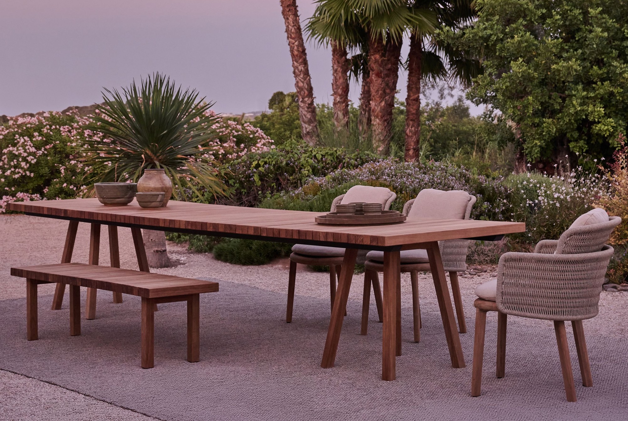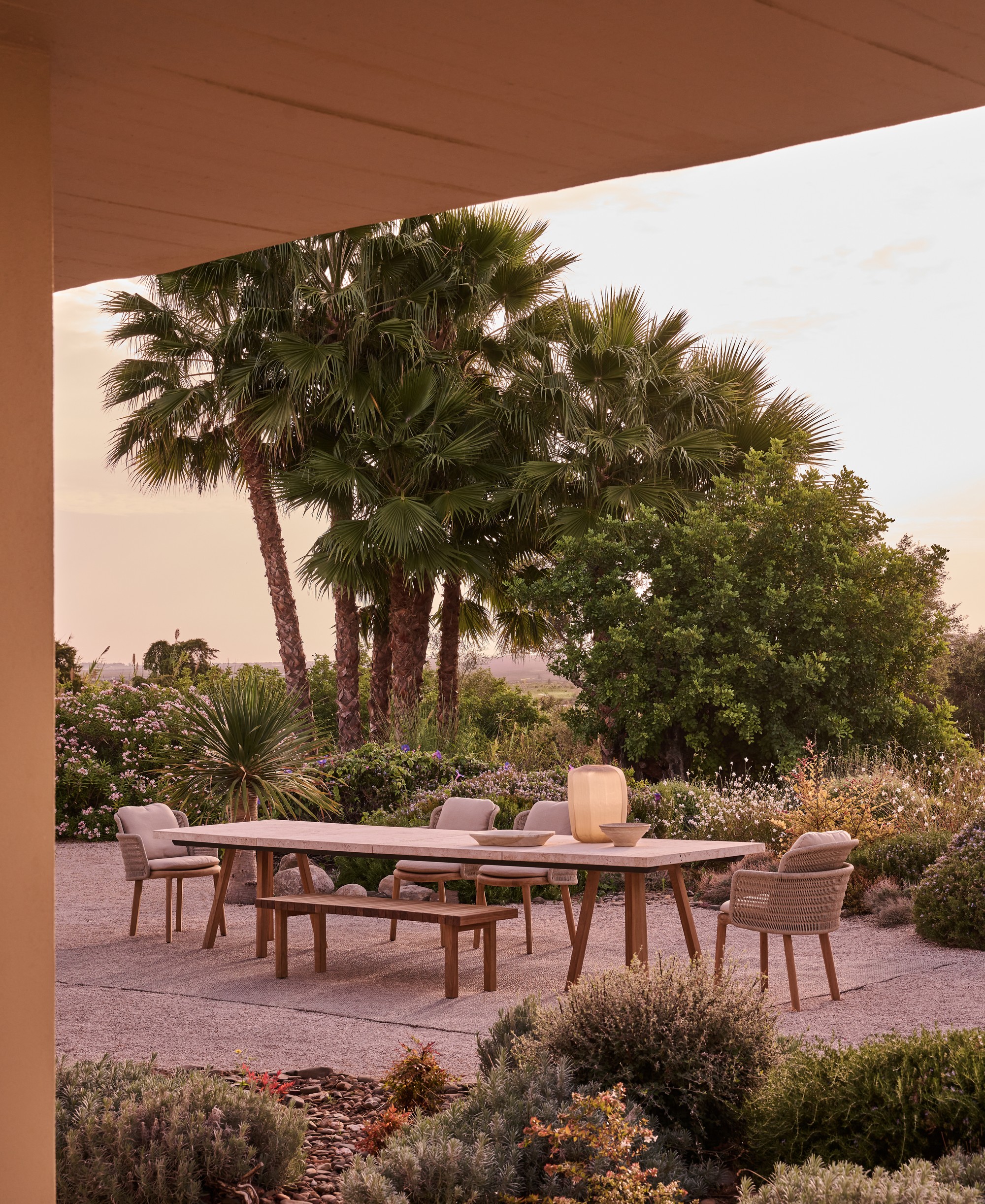 Als etabliertes Element der Vis à Vis Kollektion verkörpert der Esstisch zeitlose Eleganz und natürliche Wärme. Die edle Tischplatte ist wahlweise aus hochwertigem Plantagenteak oder Travertin erhältlich und sorgt für Tiefe sowie einen markanten Materialkontrast, während das Teakholzgestell eine harmonische Einbindung in die Kollektion gewährleistet. In großzügigen Proportionen ausgeführt, schafft der Esstisch ein natürliches Gefühl von Zusammengehörigkeit und lädt zu geselligen Momenten im Freien ein – mit Eleganz und Leichtigkeit.