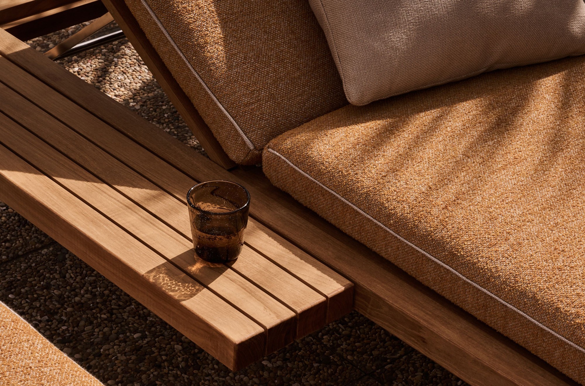 Die Vis à vis-Kollektion verleiht Außenmöbeln aus Holz eine neue Dimension. Teakholz ist das Lieblingsmaterial des Designers Piergiorgio Cazzaniga für den Außenbereich, es ist natürlich, glatt und sehr haltbar. Als er mit dem Entwurf der Kollektion begann, stellte er sich einen Ort vor, an dem es angenehm wäre, Zeit miteinander zu verbringen und zu kommunizieren. Das Ergebnis war eine extra breite Liege mit integriertem Tisch. Stellt man zwei Liegen nebeneinander mit den Kopfteilen zueinander, passen sie sozusagen ineinander und man schafft eine großzügige „Kommunikationsinsel“. Sie können den flexiblen Lattenrost auch umdrehen und dann nebeneinander sitzen.