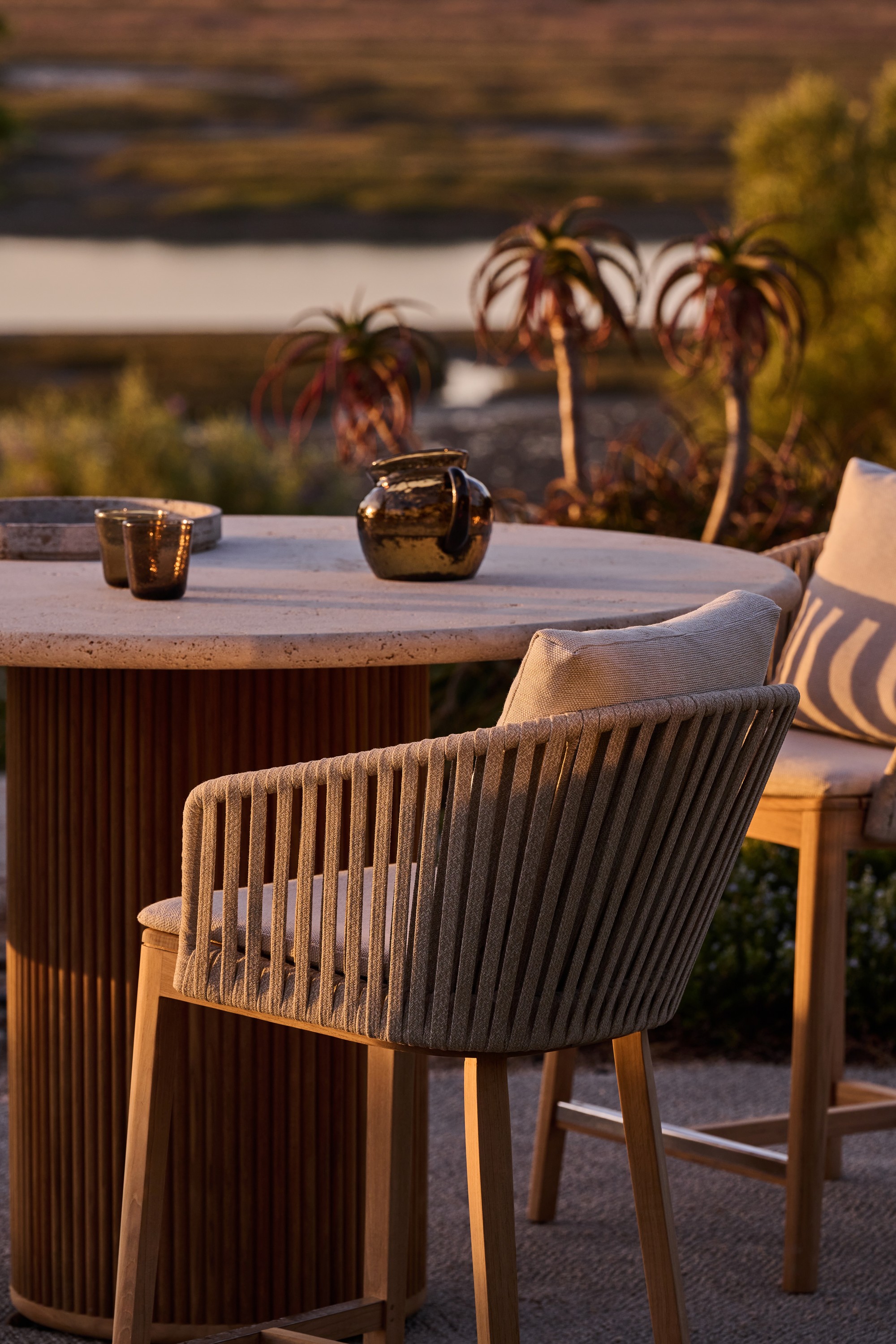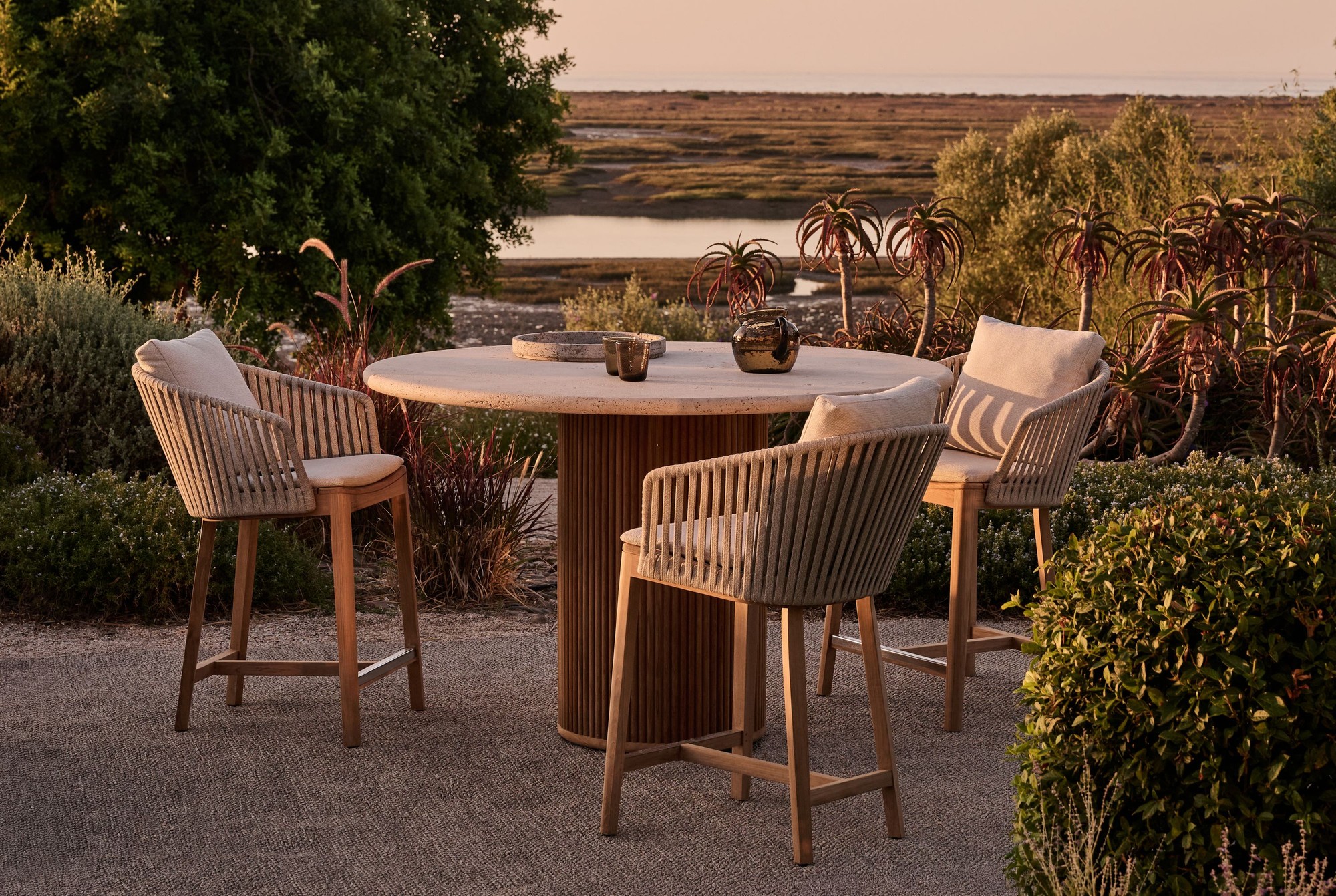 The airy design of Mood, with its warm blend of teak and handwoven backs, instantly creates an inviting atmosphere outdoors. The rounded design of the durable teak lends natural warmth to the counter height chair. Its Tricord® weaving offers a soft, tactile feel while withstanding all weather conditions. Available in natural tones that integrate easily into any outdoor setting, the chair comes in a linen or earth brown weave and pairs with back cushions in various styles to suit every preference, adding both comfort and quiet elegance.