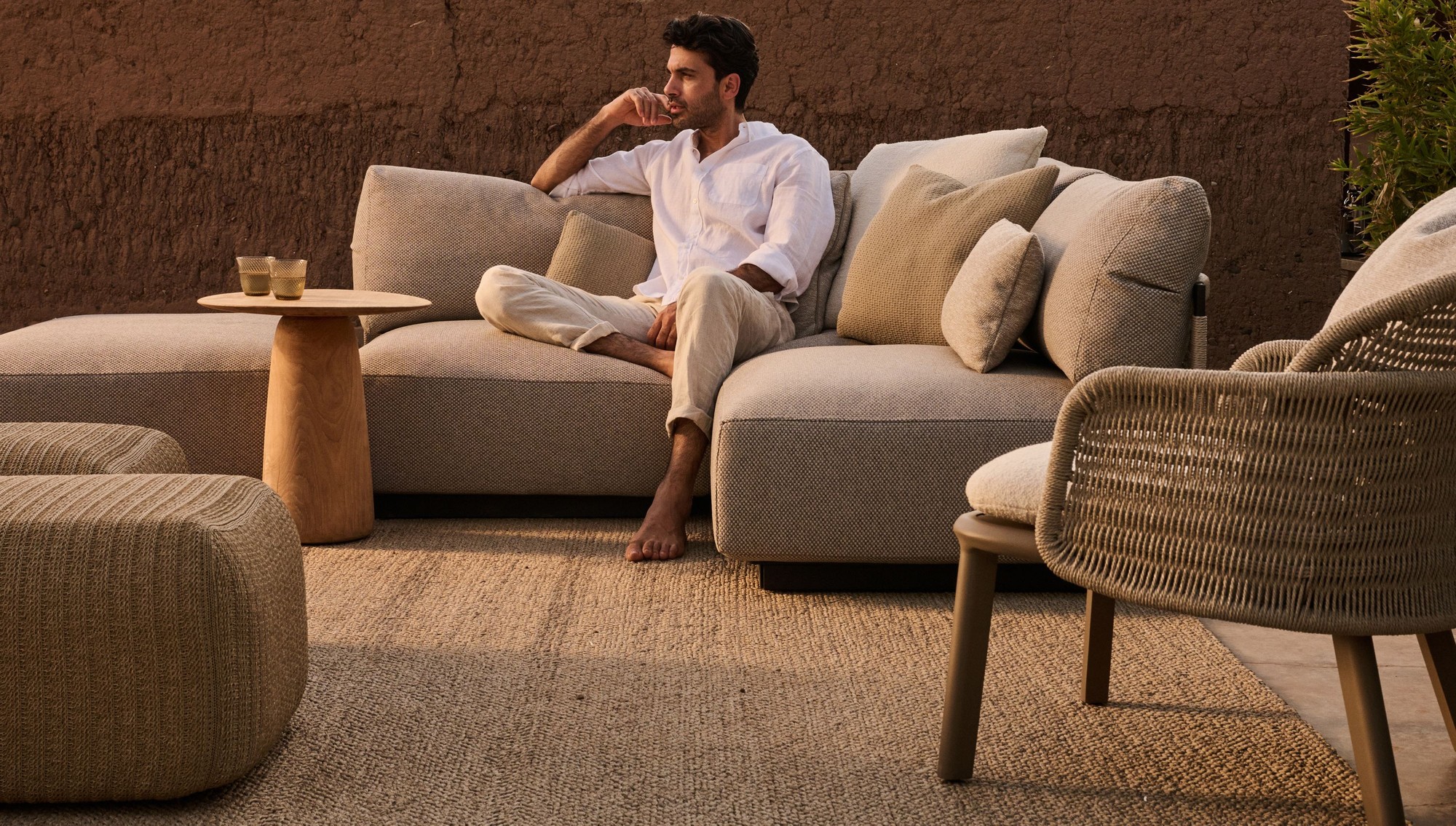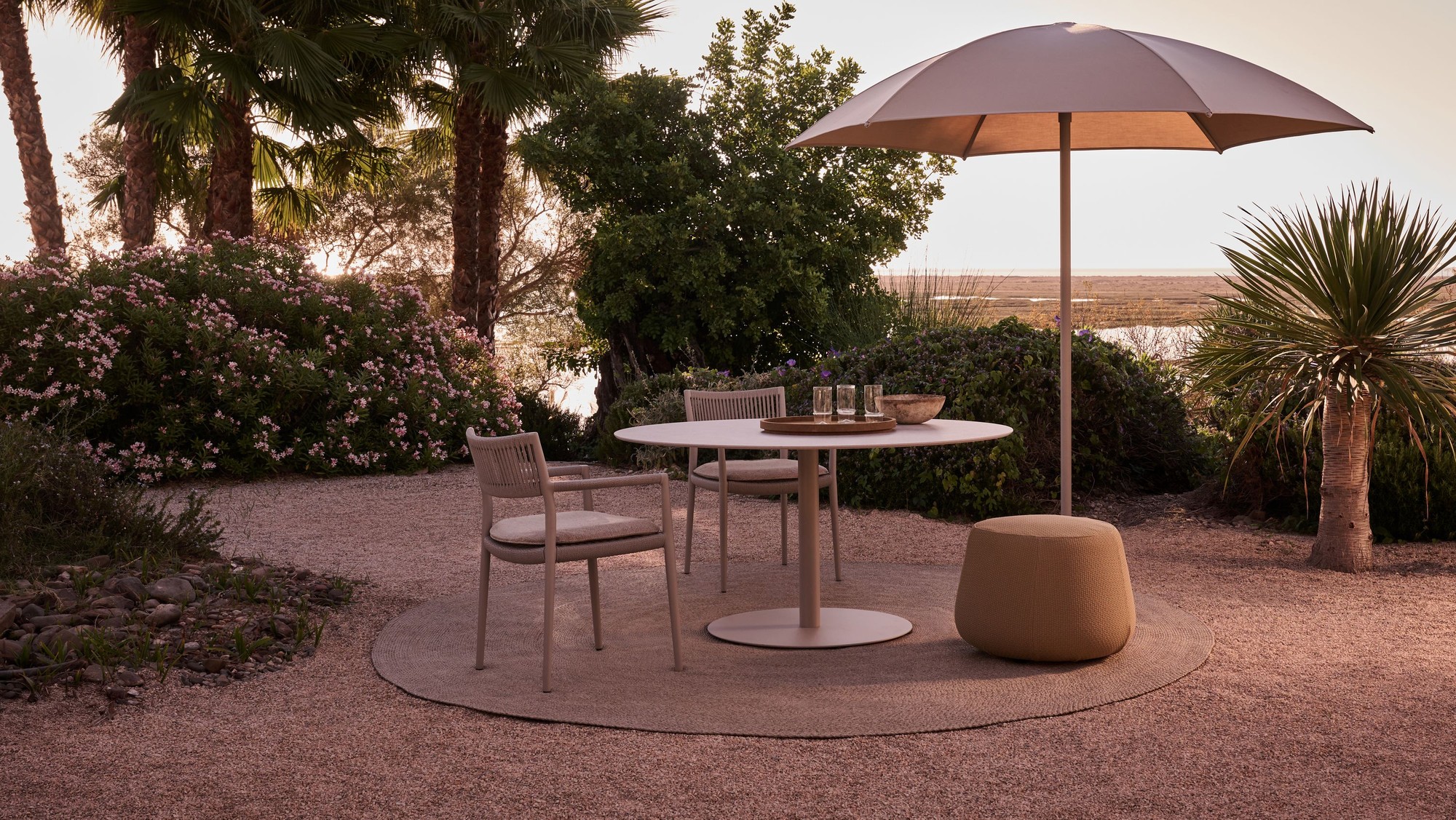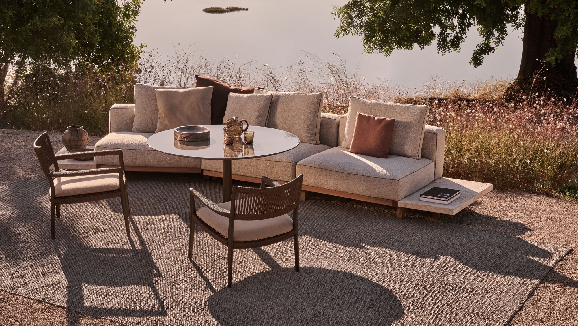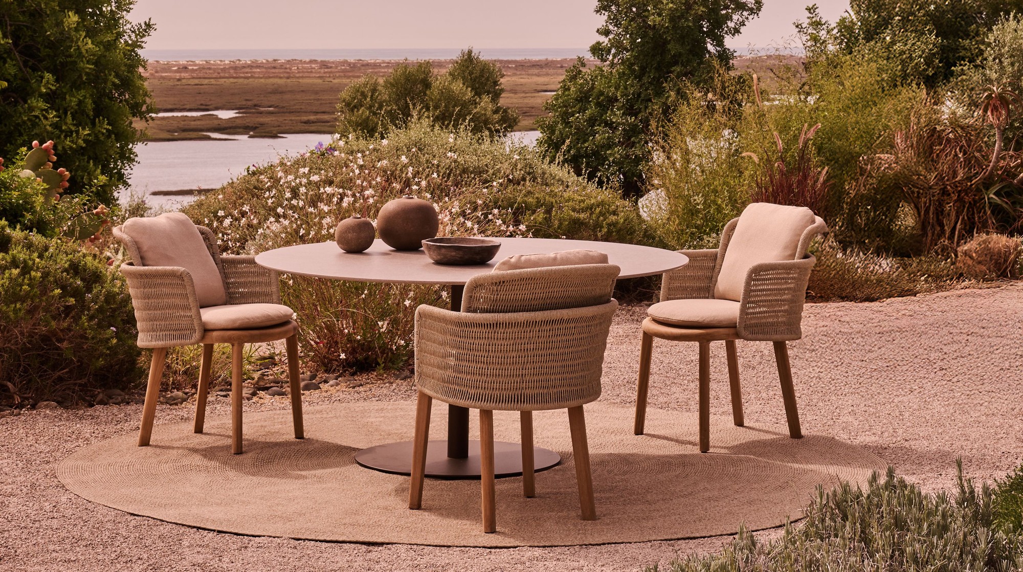 With its three-dimensional weave and warm, natural tones, the Shindi rug collection adds tactile richness and understated refinement to any outdoor space. Crafted from solution-dyed PVC-coated polyester, it is soft underfoot, durable, and weather-resistant. Available in both rectangular and round formats, including new round sizes, Shindi offers greater freedom in layout and harmonises effortlessly with both intimate and expansive outdoor settings.
