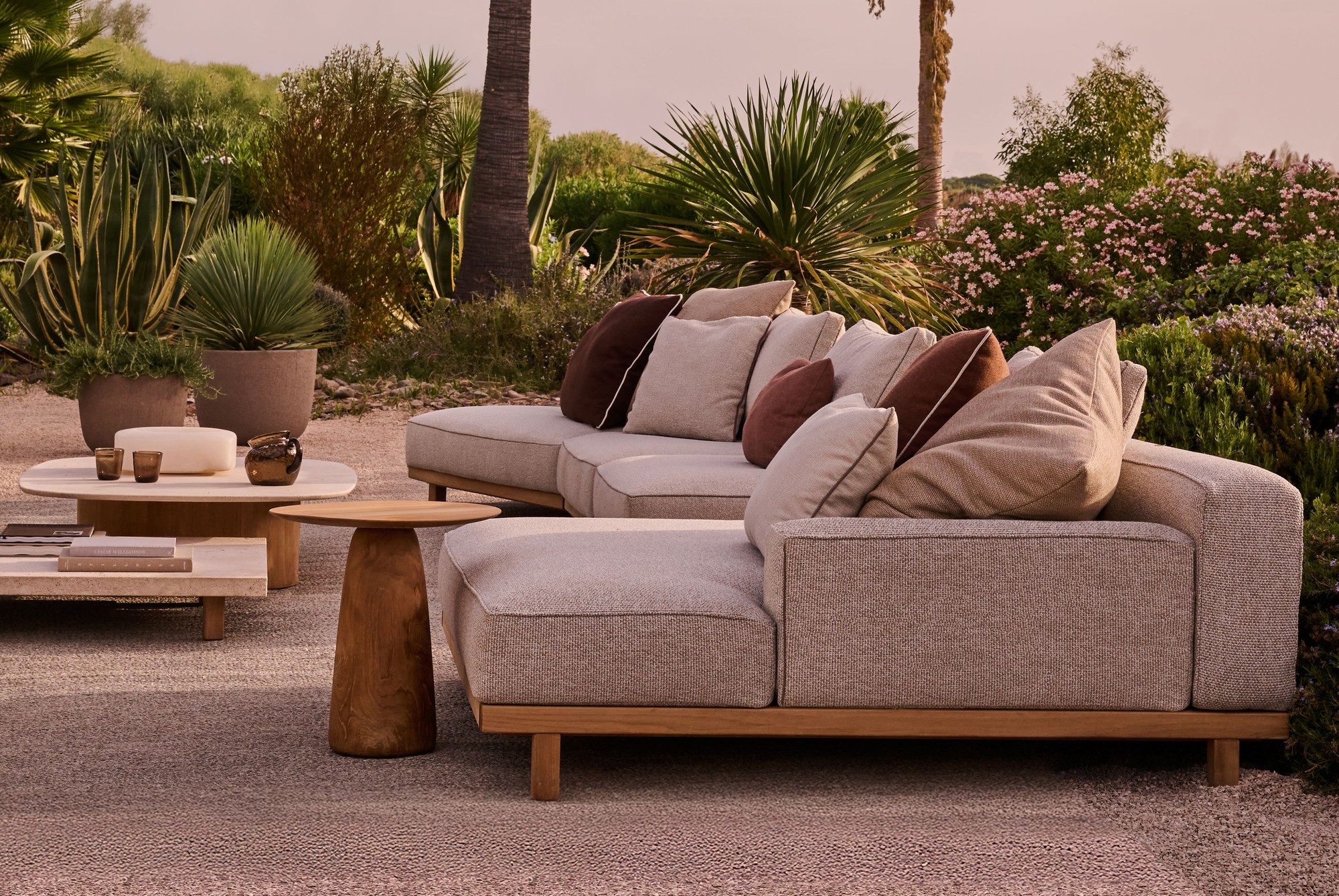 The Vis à Vis collection in premium plantation teak embodies refined craftsmanship and modular elegance. The collection’s soft, voluminous cushions are outlined by a signature piping that lends a discreet graphic rhythm. Available with or without a backrest, the double daybed transforms effortlessly from a spacious lounger into a luxurious pouf. Designed for both comfort and versatility, its modular character allows integration with the sofa and other collection pieces, creating harmonious outdoor lounge arrangements.