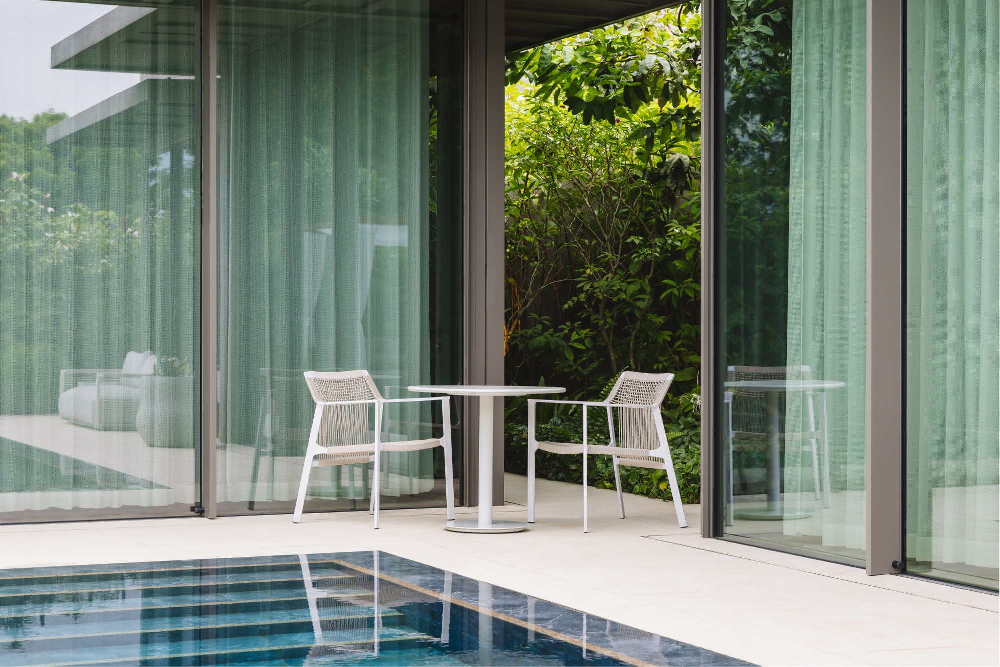 Set amidst the tropical greenery of Sentosa Island, Raffles Sentosa Singapore offers a calm and contemporary expression of resort living. Designed by Yabu Pushelberg, the city’s first all-villa retreat embraces nature through open architecture and private terraces that flow gently into the landscape. Located on a hilltop, it forms a quiet sanctuary, surrounded by lush gardens and shaped by a strong sense of wellbeing. On these terraces, Tribù’s Nodi collection by Yabu Pushelberg and the T-Table by Tribù Studio bring a refined softness to the outdoor spaces. The Nodi sofa and armchair, crafted with interlaced Canax® rope, introduce a sense of ease and lightness, while the T-Table adds a balanced, understated presence that complements the surrounding greenery. Here, every detail supports a natural connection between inside and out. Travertine underfoot, soft linen textures, and the subtle tones of the furniture create a gentle continuity throughout the villas and terraces. The result is an atmosphere that feels warm, restful and quietly attuned to its tropical setting — a place where outdoor living comes naturally.