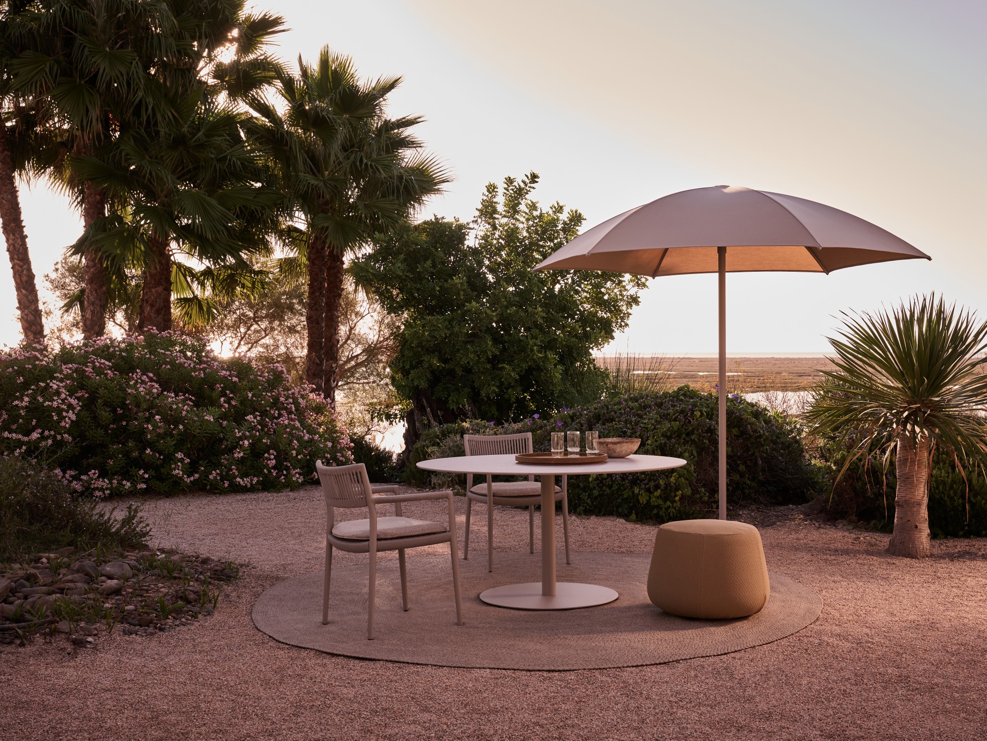 With its three-dimensional weave and warm, natural tones, the Shindi rug collection adds tactile richness and understated refinement to any outdoor space. Crafted from solution-dyed PVC-coated polyester, it is soft underfoot, durable, and weather-resistant. Available in both rectangular and round formats, including new round sizes, Shindi offers greater freedom in layout and harmonises effortlessly with both intimate and expansive outdoor settings.