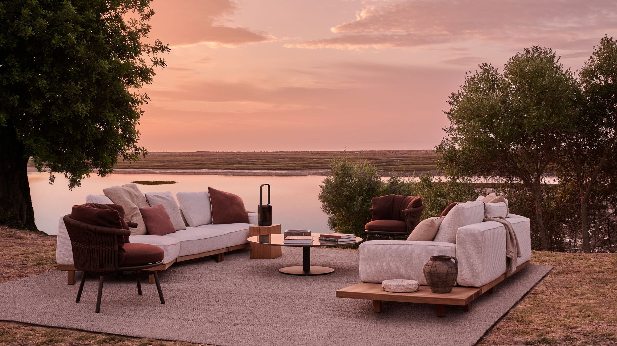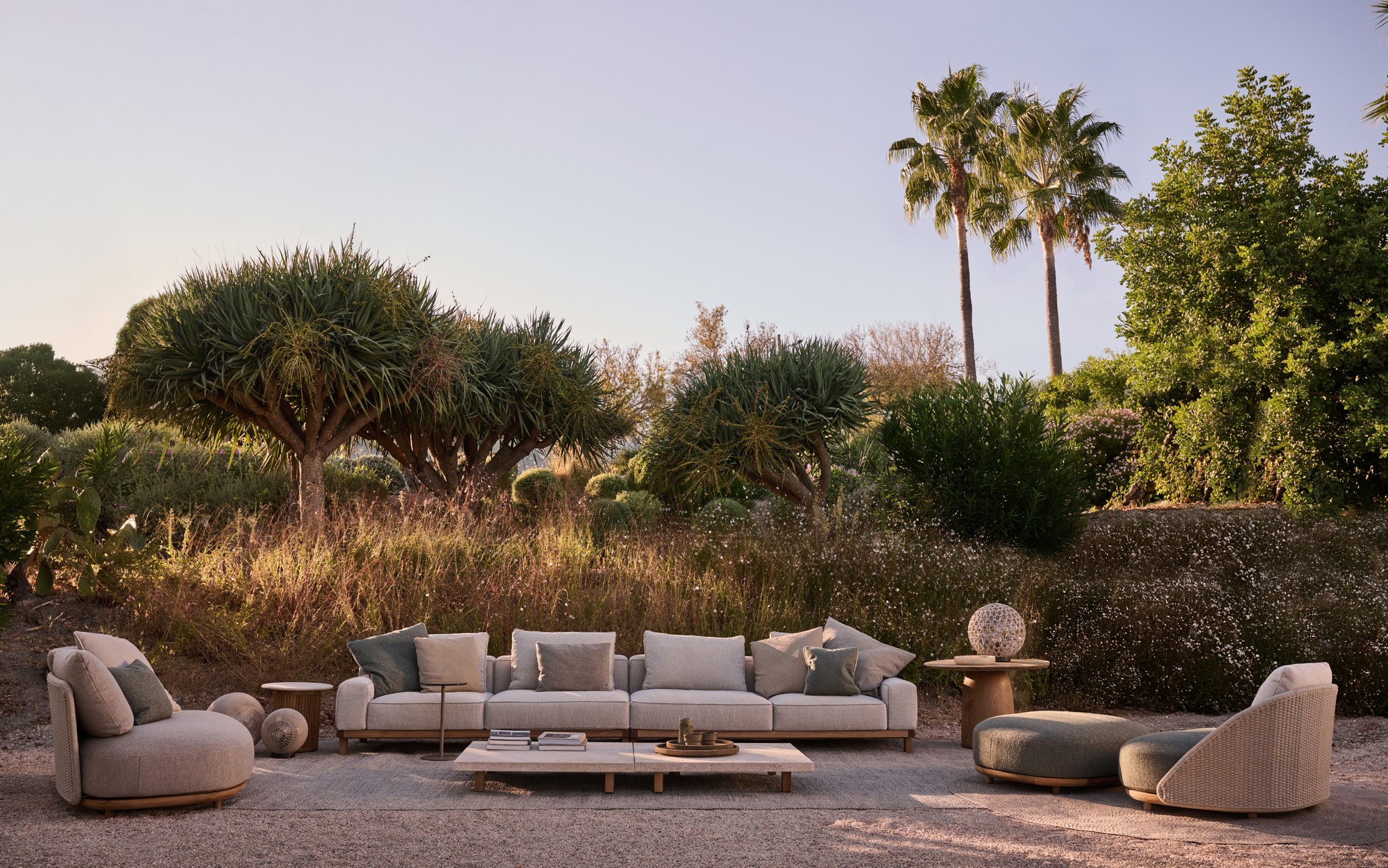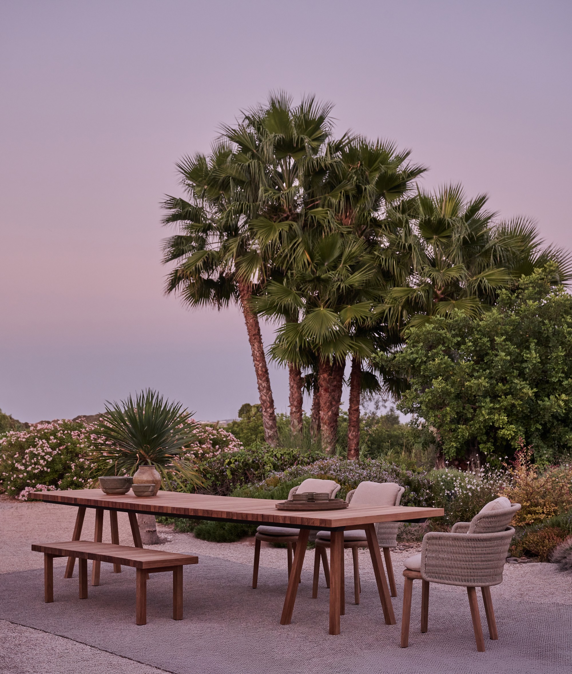 The 2026 Vis à Vis collection continues its story in premium plantation teak with subtle refinements to its modular character. The sofa has been reimagined with a softer, more voluminous cushion, outlined by its signature piping that lends a discreet graphic rhythm. The collection extends with a daybed and an organically shaped corner module, complemented by low tables in teak or travertine that connect with ease or stand gracefully on their own. Dining tables in the same materials bring a natural sense of unity to the setting. Every element of Vis à Vis is designed to invite personal compositions that fit gracefully into any outdoor environment.