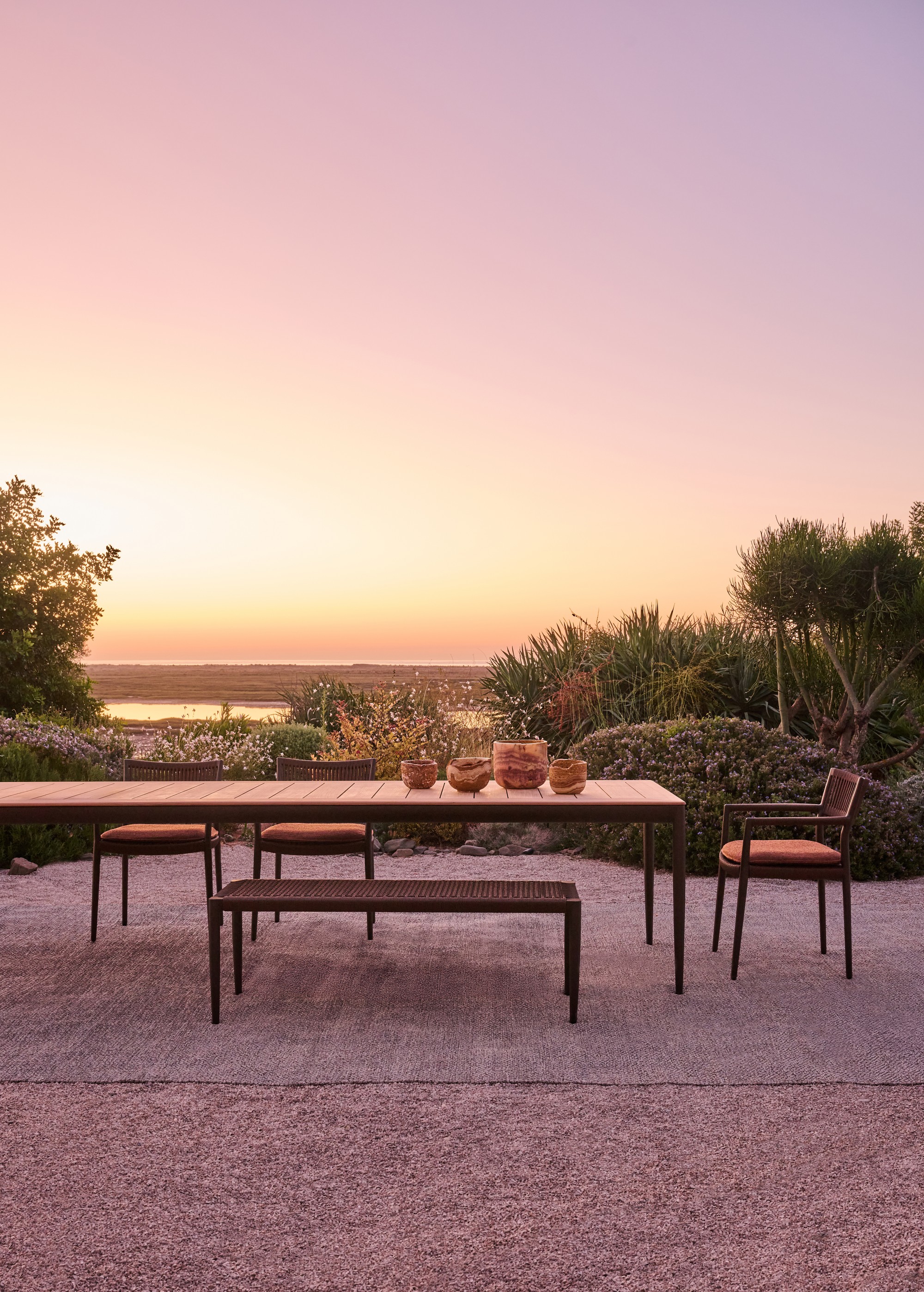 Nagomi de Inoda+Sveje invita a una sensación de calma, donde una suavidad escultórica se encuentra con una meticulosa artesanía. Inspirada en el concepto japonés de armonía y equilibrio, sus líneas suavemente fluidas y su estructura de aluminio colado ultraligero crean una presencia serena y discreta. Los detalles de Canax® tejido a mano aportan textura natural y un confort duradero, con acabados en aluminio linen con tejido linen o aluminio dark bronze con tejido copper. Concebida tanto para el comedor como para el lounge, la colección incluye un sillón, una lounge chair, un banco, mesas de comedor con sobre de teca o cerámica sobre estructuras de aluminio y una tumbona disponible con patas fijas, ruedas o apilable con ruedas. Nagomi se integra sin esfuerzo en cualquier entorno, creando espacios de tranquila sofisticación.