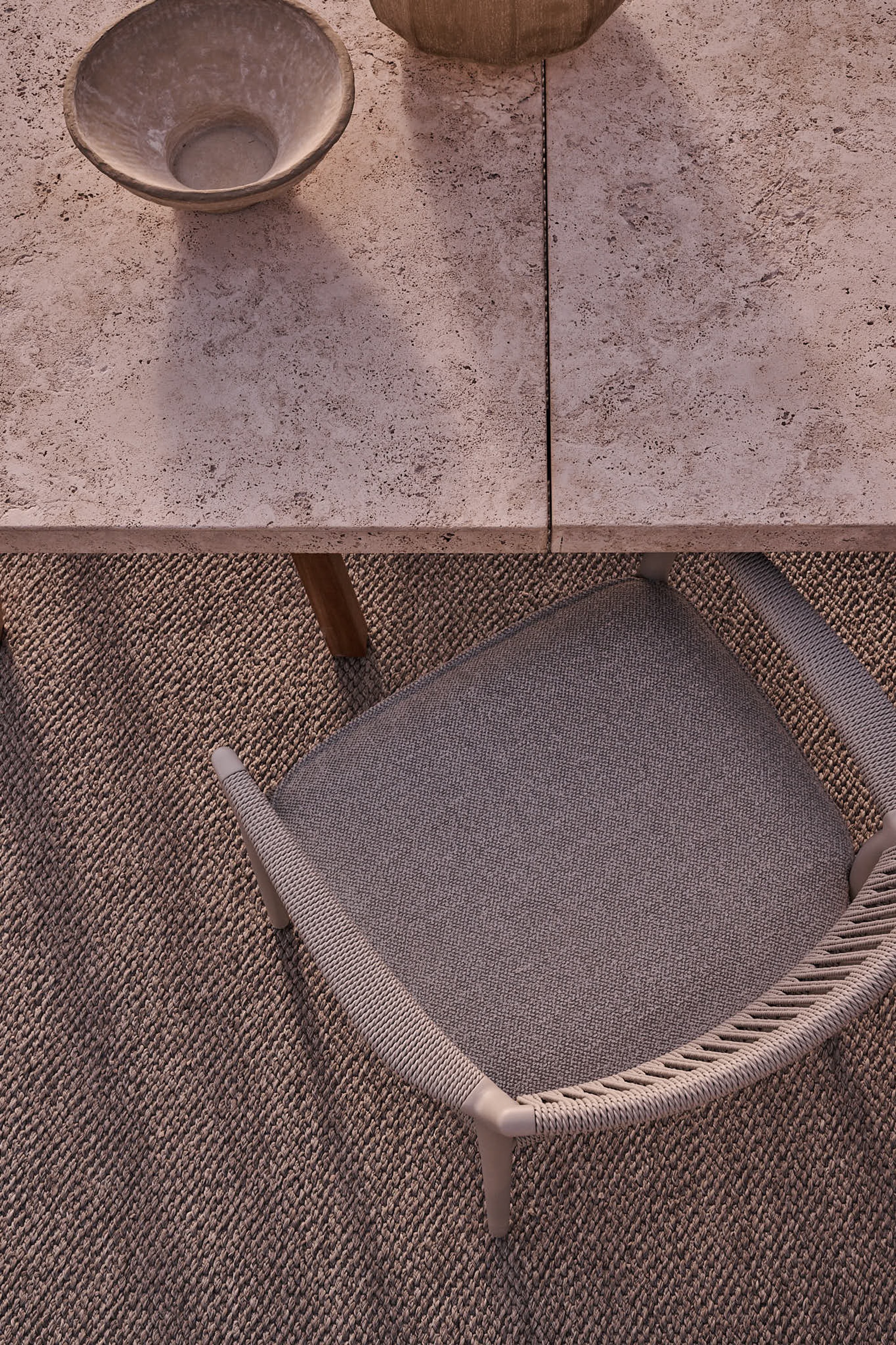 La alfombra rectangular Tanae combina una elegancia discreta con una durabilidad funcional. Tejida con hilos tubulares en una estructura plana y resistente a la intemperie, es ligera pero lo bastante firme para caer de manera limpia y uniforme. Las sutiles variaciones tonales aportan una calidez natural, disponible en Linen o Hemp. Ofrecida en varios tamaños, Tanae enmarca los espacios exteriores con una refinada sencillez.