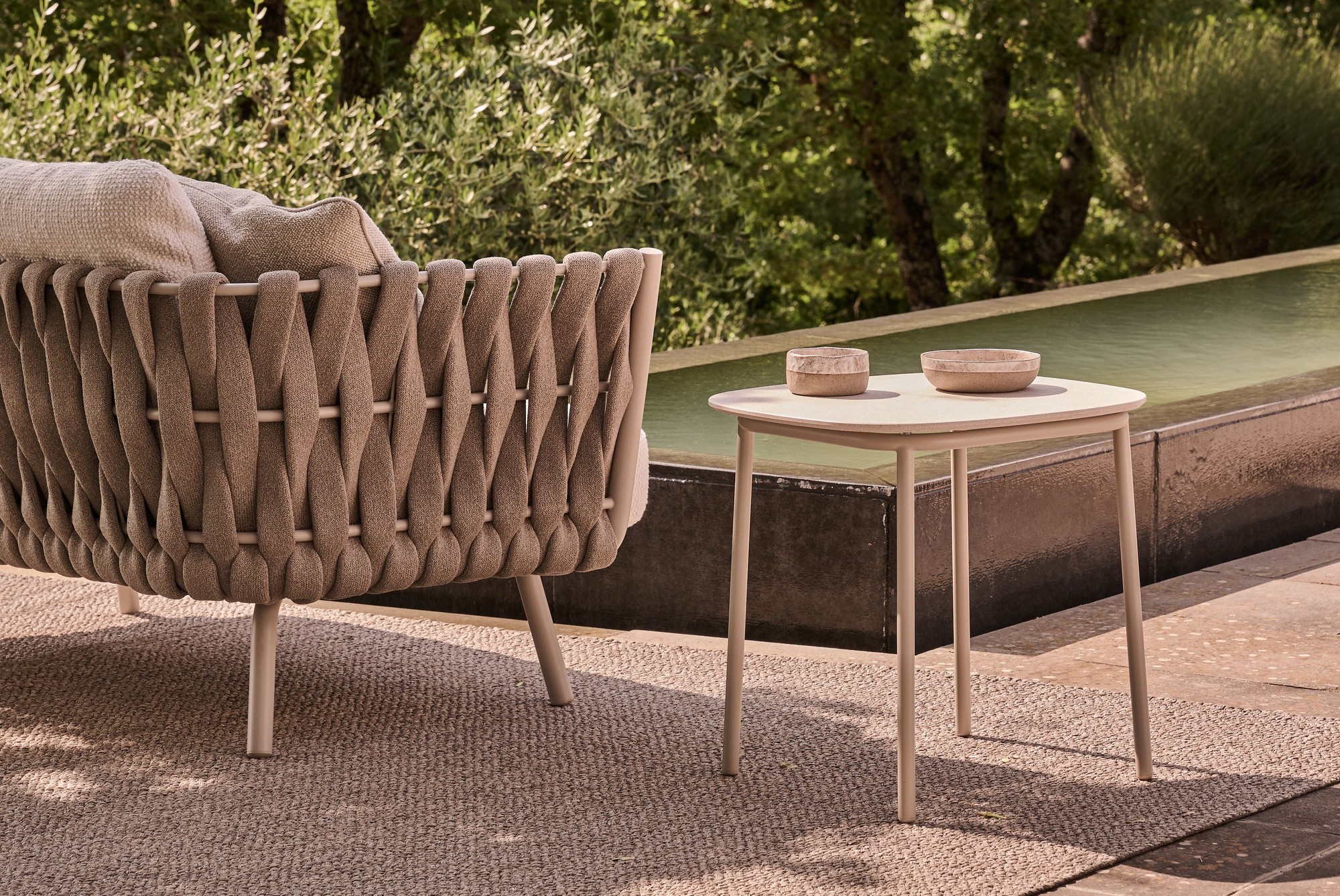 Om de exclusieve collectie Tosca compleet te maken, ontwierp Monica Armani een koffietafel en hogere bijzettafel. Ze hebben dezelfde ranke, taps uitlopende pootjes als de zitmeubelen en een tafelblad met een unieke ovale vorm. Het blad uit keramiek heeft een subtiel gewolkt patroon. Keramiek is ideaal voor buiten, het is uiterst bestand tegen vlekken, krassen, vorst en UV-stralen, en bovendien zeer makkelijk te onderhouden.